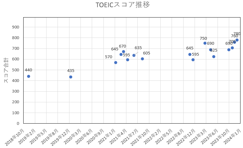 2023年3月に750点取得(今考えると偶然)できましたが、その後は英語学習に注力できずスコアが下がる一方でした。